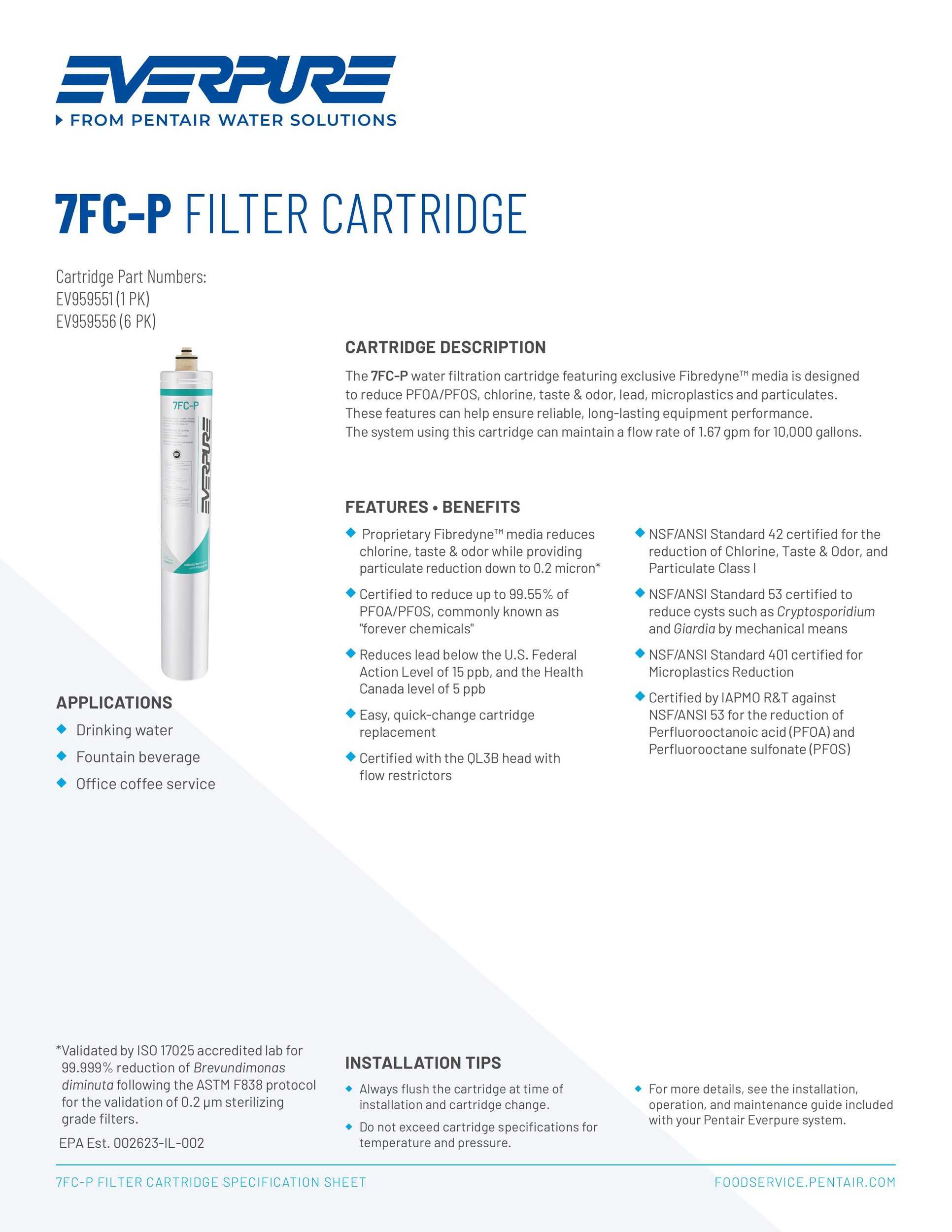 - 濾孔小於 0.2 微米(約為 1/50,000 公分),可有效攔截大腸桿菌、囊孢菌、賈第蟲(Giardia)、隱孢子蟲(Cryptosporidium)、微生物、懸浮物、石棉纖維等有害污染物,確保飲水安全。同時強力吸附異色、異味與餘氯,並可去除汞等重金屬,提升飲用口感與安全性。
